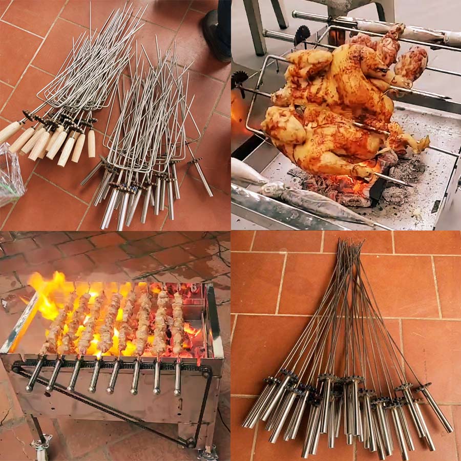 Máy đi kèm 4 xiên thẳng và 1 xiên chạc 3 , phục vụ nhiều món khác nhau: từ xiên thịt, củ quả cho đến gà, vịt nguyên con.